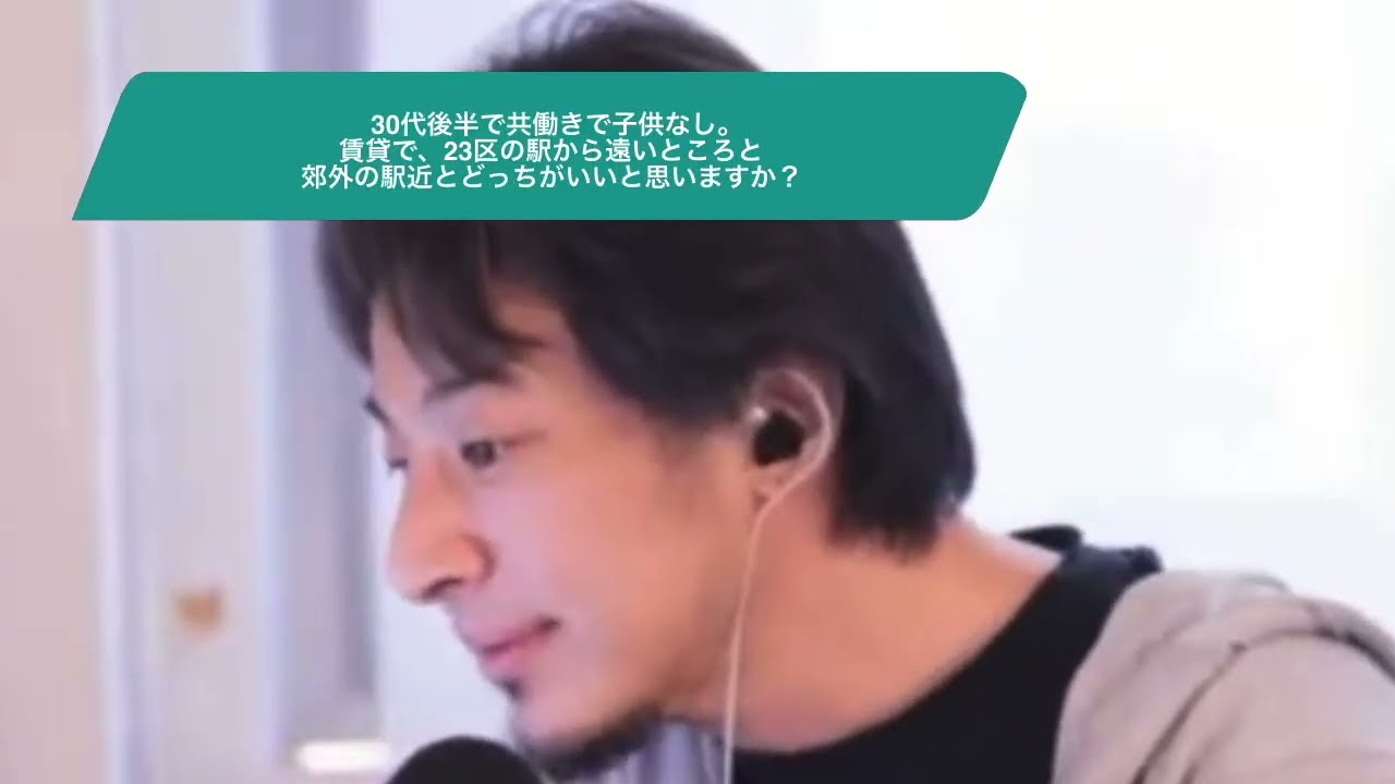 30代後半で共働きで子供なし。賃貸で、23区の駅から遠いところと郊外の駅近とどっちがいいと思いますか?家賃と通勤時間は同じとします。ひろゆきさんが家を決める時の譲れない条件ありますかー?