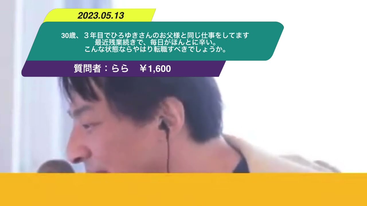 【ひろゆき】30歳、3年目で、ひろゆきさんのお父様と同じ仕事をしています。最近残業続きで、毎日がほんとに辛い。こんな状態ならやはり転職すべきでしょうか。ー ひろゆき切り抜き 20230513
