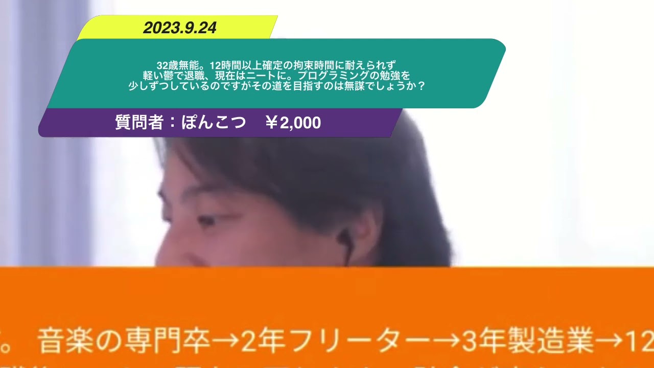 【ひろゆき】32歳無能。12時間以上確定の拘束時間に耐えられず軽い鬱で退職、現在はニートに。プログラミングの勉強を少しずつしているのですがその道を目指すのは無謀でしょうか? ー 20230924