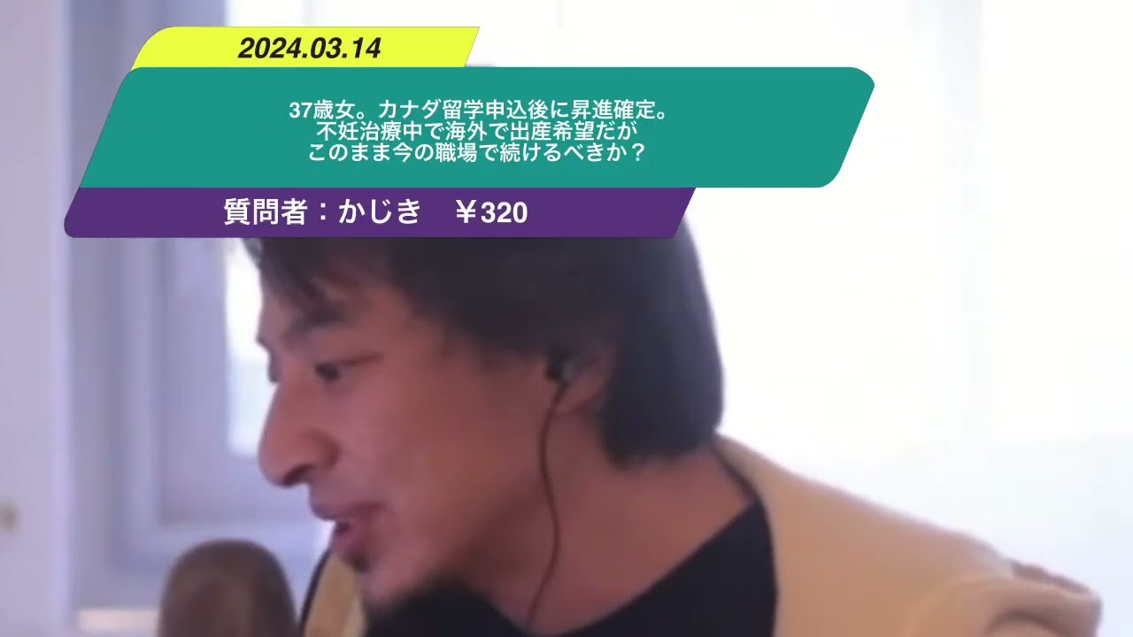【ひろゆき】37歳女.カナダ留学申込後に昇進確定.不妊治療中で海外で出産希望だがこのまま今の職場で続けるべきか?ー ひろゆき切り抜き 20240314