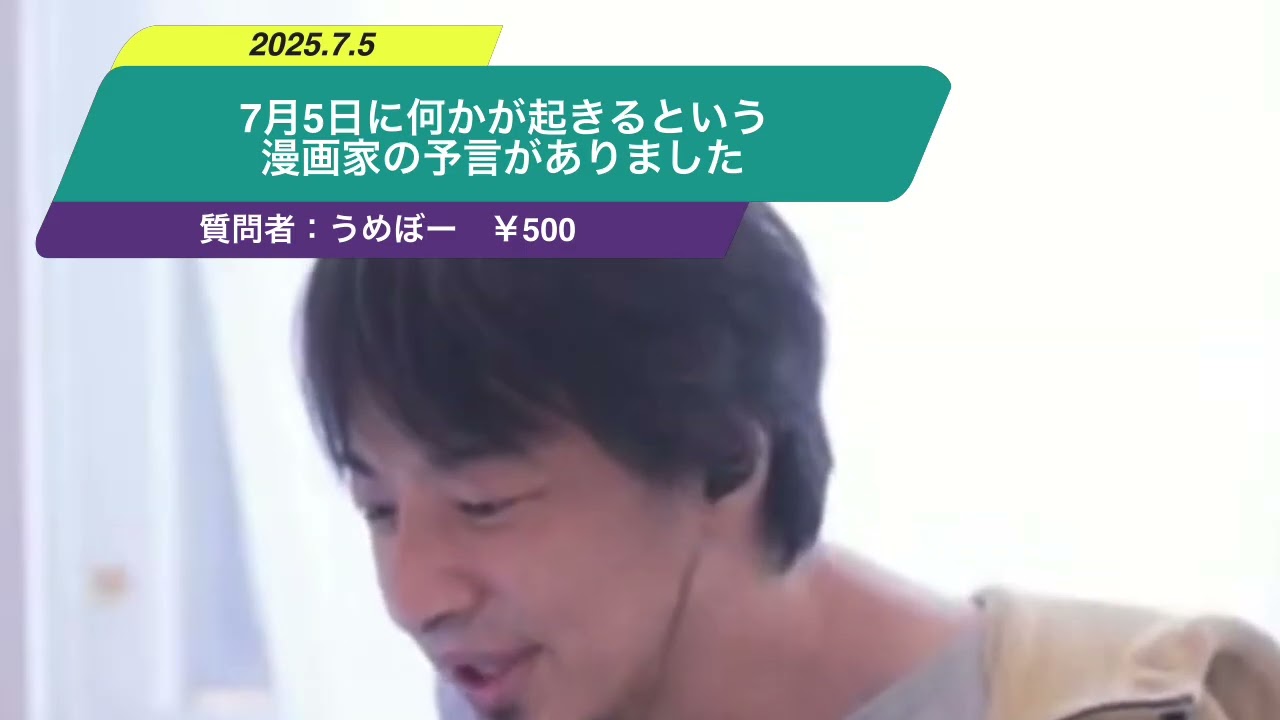7月5日に何かが起きるという漫画家の予言がありましたが、結局何も起きる様子はありません。あんな根拠のないことを真に受ける人はやはり普段から誰かの言うことを鵜呑みにして、自分の頭で考えることをしないのでしょうか。こういう人達が陰謀論に踊らされるんだろうなと、改めて実感しました。