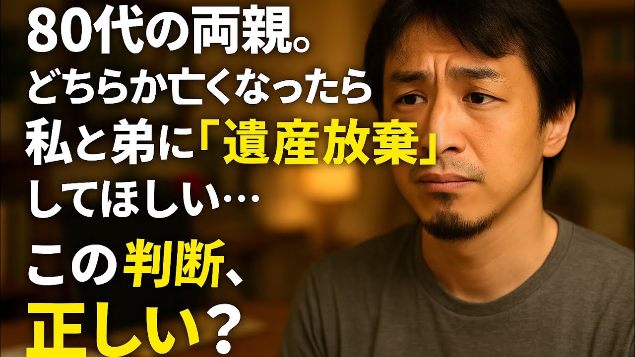 【質問】80代の両親は将来の不安から、両親のうちどちらかが亡くなった場合、「遺産放棄してほしい」と言われました。両親と私と弟の4人です。従来遺産分配で1/4私が貰っても残った親は数千万は残るのですが不安らしいです。もし私と弟が遺産放棄すると残った親が亡くなった場合、相続税が発生します。両親の判断は正しいのでしょうか。釈然としませんので拒否するつもりです。ひろゆきさんの考えをお聞かせください。