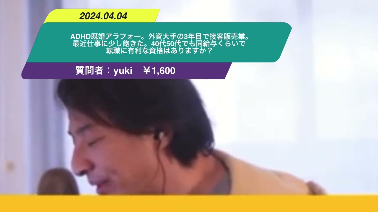 Kind: captionsLanguage: ja[音楽]おあこっちか行きさんはいえADHD既婚ア4です外店の3年目で接客販売業をしていて一般職で年収850万です最近仕事に少し飽きてきました天然が難度で体力続く限りいもの仕事を続けることは可能ですが何かあった時に資格取っておくべか悩んでいます現在保有資格もなし英語もしれません40代50代でもド級くらいで転職に有かれますか独立は希望してませんえっとま今更何らかの資格を取って一気に年収が上がるっていうのはかなり難しいのでなのでまPC扱う系の資格とかま互角を今更やっても厳しいのであのなんかExel扱います系の資格とかも多少あった方がいいと思うんですけどでも現状年収850万もらってるんだったら全然十分だと思うのでその会社でずっと暮らしてくっていうのでいいんじゃないかなと思いますけどねあのその嫌われたり首にならないようにその会社でうまく立ち回るという方がよっぽど年収にとってはいいんじゃないかなと思いますけどもはい