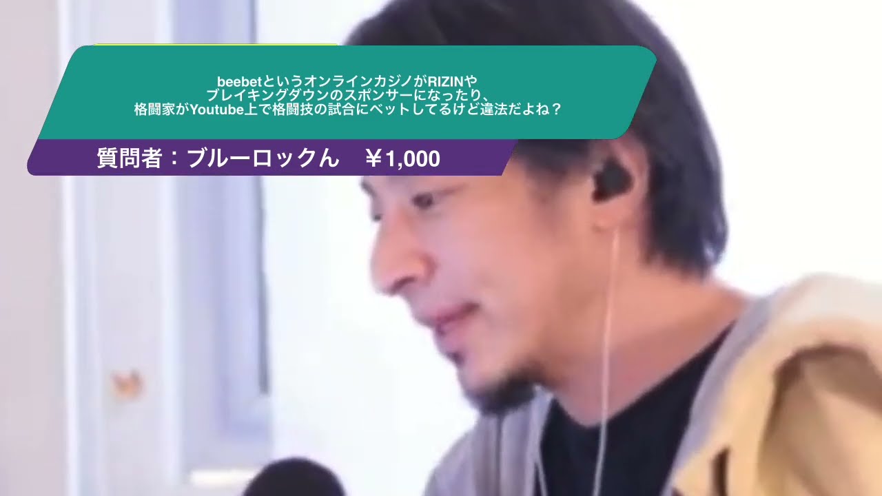 beebetというオンラインカジノがRIZINやブレイキングダウンのスポンサーになったり、格闘家がYoutube上で格闘技の試合にベットしてるけど違法だよね?