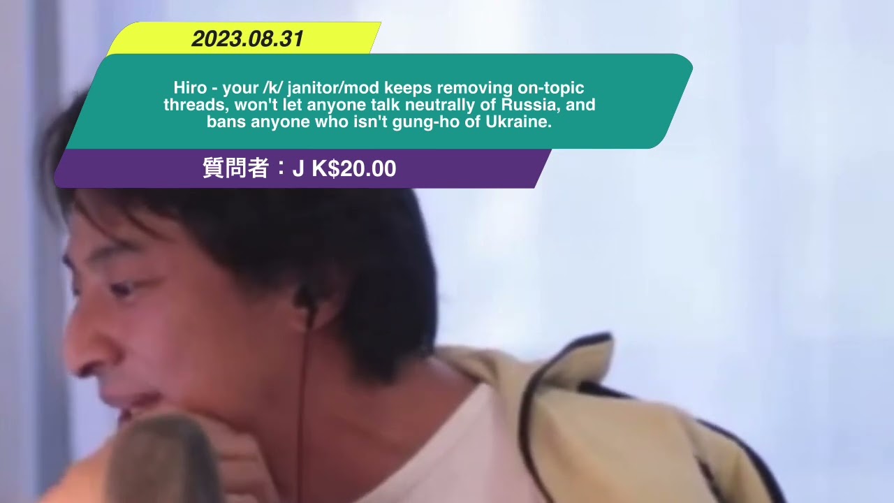 Hiro – your /k/ janitor/mod keeps removing on-topic threads, won’t let anyone talk neutrally of Russia, and bans anyone who isn’t gung-ho of Ukraine. The janitor is out of control.