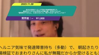 性格・メンタルヘルス 【ひろゆき】自分は背骨がヘルニア気味で発達障害持ちで、朝起きたりするのが苦手な27歳主婦。おまわりさんに「警察受けてみなよ」と言われました。受けてみるべきでしょうか?ーひろゆき切り抜き20231128