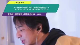 【動画の概要】質問者:タピオカ ¥2,000こんばんは。2日続けてやる事もあるんですね。 ひろゆきさんはスパチャに答えながらチャットのコメントも速読みたいに拾えるのはスゴいと思いました 慣れない人が生配信するとスパチャをがん見してフリーズし...