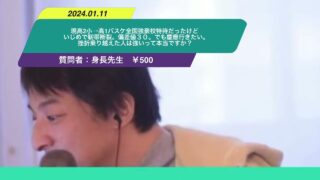 【動画の概要】質問者:身長先生 ¥500現高2小→高1バスケ全国強豪校特待だったけどいじめで靭帯断裂後遺症手術、無理なった偏差値30バカだよ、バカだけど、一浪でもいい慶應行きたい。前ひろゆきに聞いたら一教科特化って言ってたけど、俺は慶應行き...