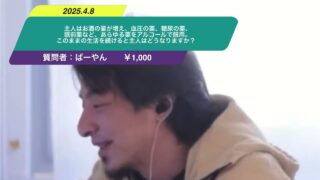 Uncategorized 【ひろゆき】主人はお酒の量が増え、血圧の薬、糖尿の薬、眠前薬など、あらゆる薬をアルコールで服用。このままの生活を続けると主人はどうなりますか?ー ひろゆき切り抜き 20250408
